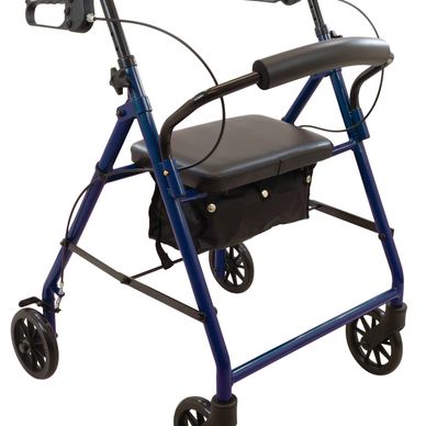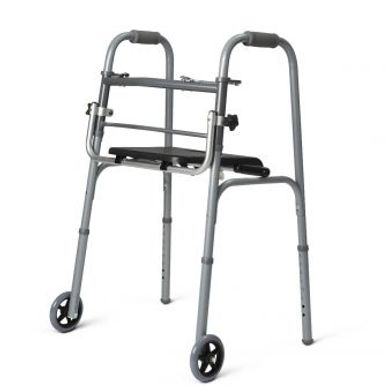 The 2-Wheel Folding Walker with roll-up seat provides patients with the convenience of a rollator and the functionality of a walker. It features easy-to-use push button mechanisms allowing each side to operate independently for movement through narrow spaces. When not in use, it rolls up and stores on the frame allowing for a full stride.