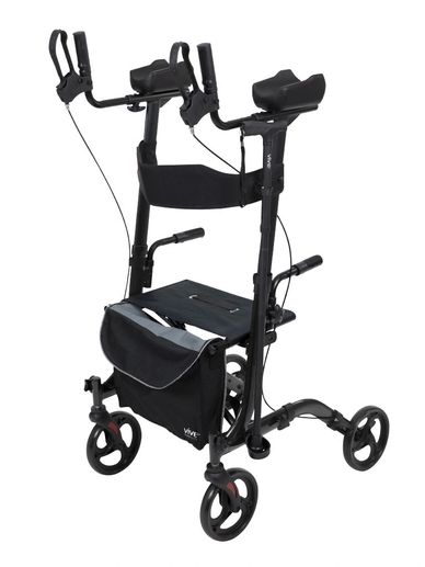 Providing comfort and stability while walking, the upright walker features tall adjustable handles to eliminate hunched shoulders and promote proper posture. Each arm rail is height and length adjustable and features soft, contoured armrests and textured hand grips for greater control and comfort. The lightweight aluminum walker weighs approximately 20 pounds and is compact when folded for easy travel.