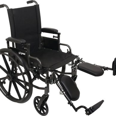 Wheelchair Dual Axle , desk length arm swing away footrest in black upholstery. 18in. Seat width with 300lbs weight capacity. Carbon steel frame with a textured, silver-vein finish for enhanced visual appeal and e...